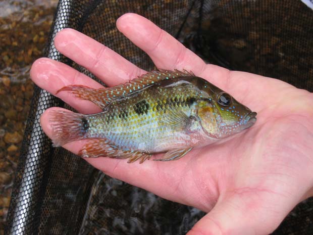 Am Rio Belaire, von Rusty Wessel neben dem Rio Jutiapa und Rio Hauron als Typusfundort von T. wesseli angegeben, hatten wir erneut unbeschreibbares Glück. Insgesamt konnten wir an zwei Tagen dort zu viert nur eine handvoll T. wesseli ausmachen. Wessel beschrieb T. wesseli als äußerst rar („...one T. wesseli in every 1000 fishes...“), er unternahm zwölf Reisen in fünf Jahren dorthin, nur um diesen Buntbarsch zu fangen. Und wir, wir hatten sie nach einer halben Stunde! Achim fand ein tapferes, brutpflegendes Weibchen, etwa 20 cm groß, mitten in der starken Strömung mit freischwimmenden Jungtieren. Zu viert (!) konnten wir schließlich mehr als 40 Jungtiere eintüten, die sich immer wieder unter großen Felsen versteckten, während sich die treusorgende Mutter erst bei einem Abstand von weniger als einem halben Meter zu uns entfernte.